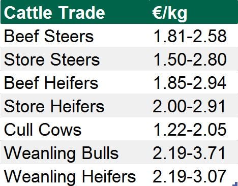 The hammer fell on the forward beef steers from €1.81-2.15/kg while the lighter stores sold from €1.99-2.17/kg, he said.
