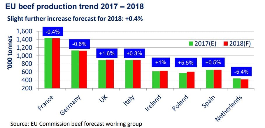 Looking forward to 2018, it is forecast that beef production across the EU will increase by a more modest 0.4%.