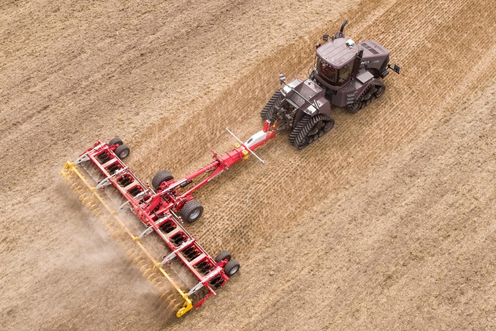 When turning at the headlands, the weight of the discs and frames is transferred to the rollers. This is said to result in a light footprint – avoiding the extra soil compaction caused by requiring extra road-wheels to carry the additional weight.