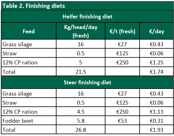 Like many finishing farmers, keeping the cost of feed margin as low as possible is a key target. As can be viewed in table (below), Irvine’s diet for his heifers is costing approximately, on average, €1.74/head/day.