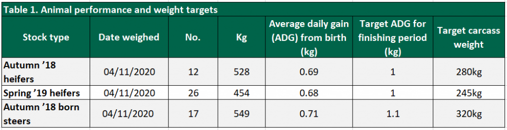 The aim for these females is to reach a carcass weight of 280kg and 245kg for the autumn and spring-born heifers, respectively. To achieve this, a target average daily live weight gain (ADG) of 1kg/day has been set for all heifers prior to slaughter before the end of the year.