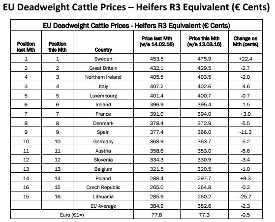 It also shows that the increased price difference between Irish and Northern beef occurred due to movements in the currency markets, as €1 bought 77.3p Sterling during the week ending March 13.