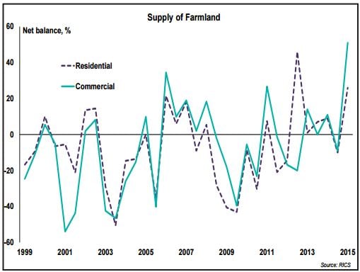 Land prices in England and Wales have by increased by £200/ac or €278/ac in the first six months of 2015, this is despite a sharp increase in the supply, says the Royal Institution of Chartered Surveyors (RICS).