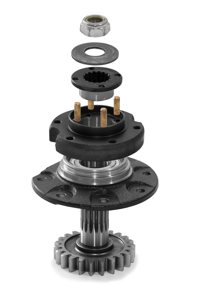 The DDSS system consists of an intermediate flange with brass shear pins, which shear in the event of a disc overload – to prevent damage to the mower bed’s gear-drive system. The shear pins can apparently be changed “quickly and easily”.