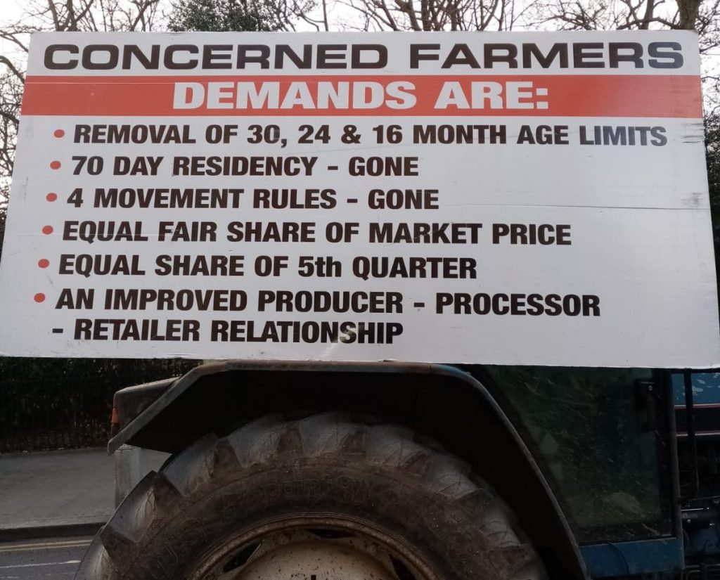The protesters, comprising beef farmers who are demanding a higher rise in beef price, outlined their demands, including: a removal of the 30, 24 and 16 month age limits; as well as a removal of both the residency rule; and the four-movement rule, among other items.