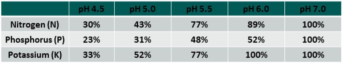 Lime is essential to maximise the returns from fertiliser (shown in the table below). Raising soil pH from 5.5 to 6.5 will increase the efficiency of fertiliser by >25%. Lime will deliver a return on investment of 7:1.