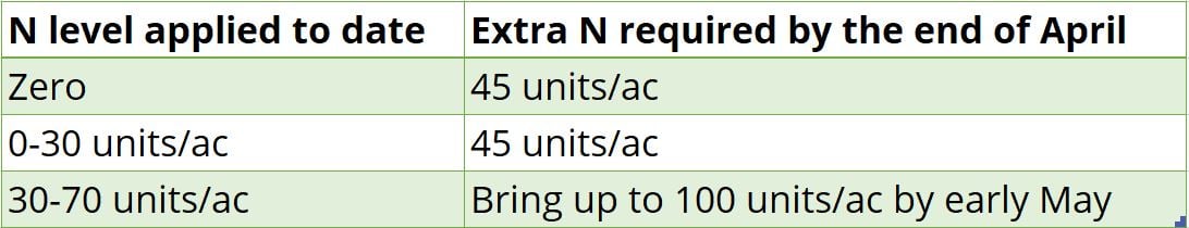 If no chemical K or slurry has been applied, reduce K to 60-70 units/ac to avoid the luxury uptake of potash.