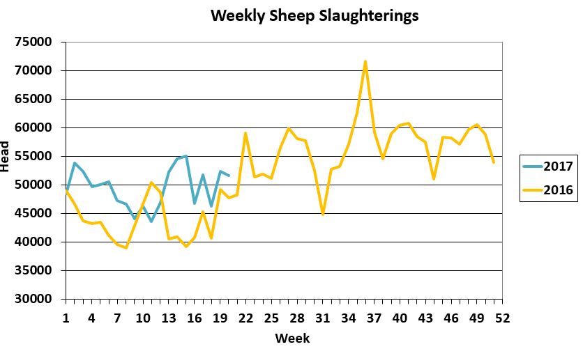 Official figures from the Department of Agriculture’s sheep kill database show that some 25,931 lambs were slaughtered during the week ending May 21. This is an increase of 4,743 head or 22.4% on week earlier levels.