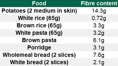 The slow-release, high-fibre carbohydrate contributes much more to the diet than other fibre sources. Two medium potatoes – with the skin on – contain 14.3g of fibre. This can be compared to other sources of fibre such as white rice. It contains just 0.72g.