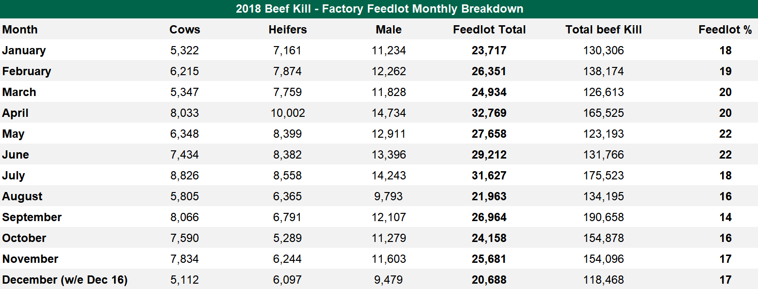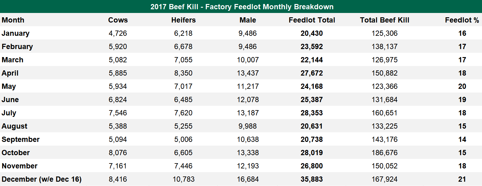 Turning to 2017, an analysis of official department figures shows that 21% of the total beef kill originated from ‘factory feedlots’ last December.