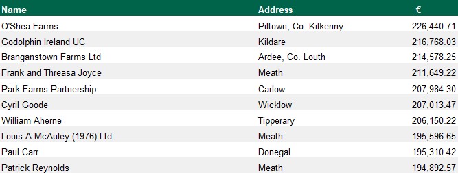 Patrick Reynolds of Co. Meath rounded off the 10 highest recipients with a payment of €194,892.57.