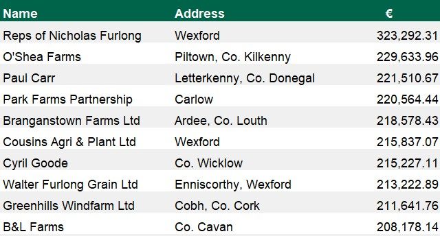 Wicklow farmer Cyril Goode received €215,227.11; while Wexford enterprise Walter Furlong Grain Ltd received a direct payment worth €213,222.89.