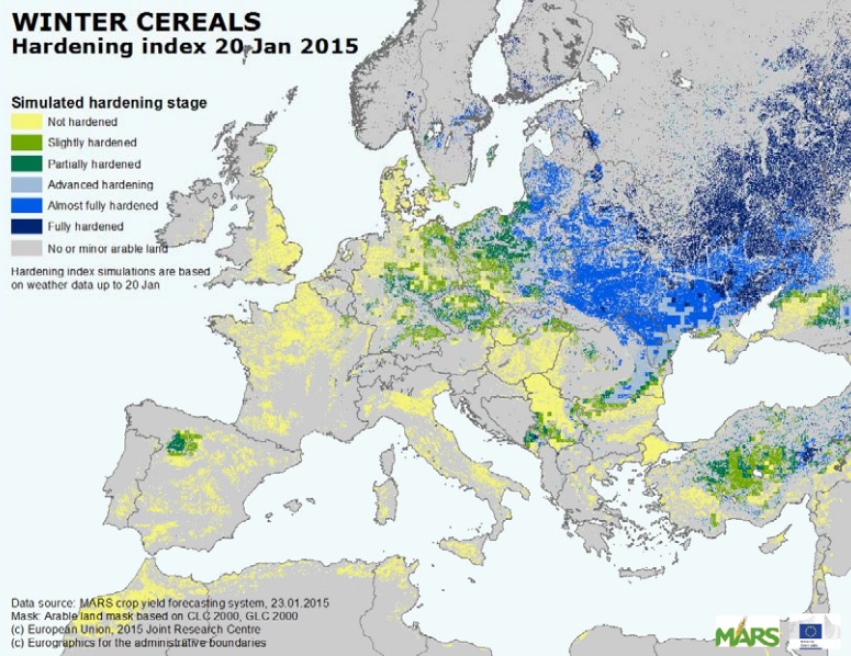 The European Commission’s latest frost-kill model simulations show no or only a slight degree of hardening in the Mediterranean region and a wide area between Ireland and eastern Poland, due to the fact that this region experienced mostly warmer-than-usual daily temperatures since early December.