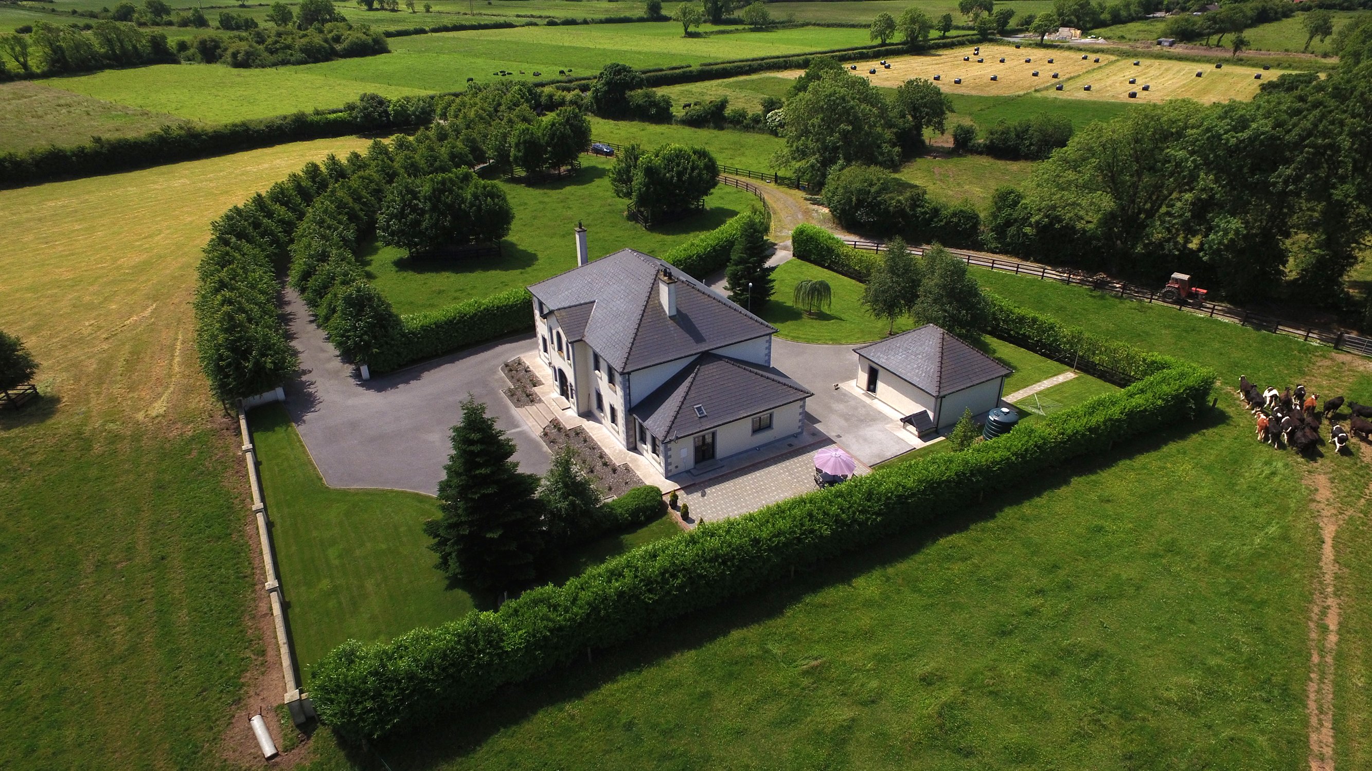 This fine house is located in a private setting, accessed via a tree-lined studded rail-kerbed tarmacadam driveway with a tarmac yard to the front and rear.
