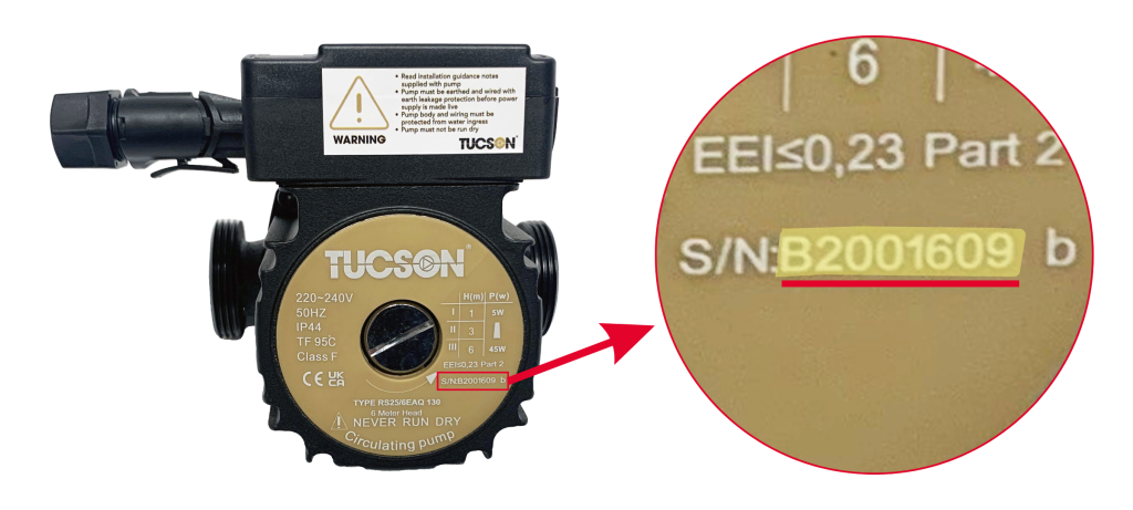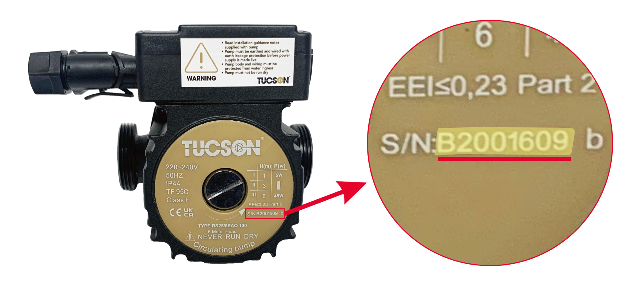 Tucson 5m, 6m and 8m pumps are affected, and can be identified by checking the serial number – a series of digits starting with S/N, listed on the label of the pump.