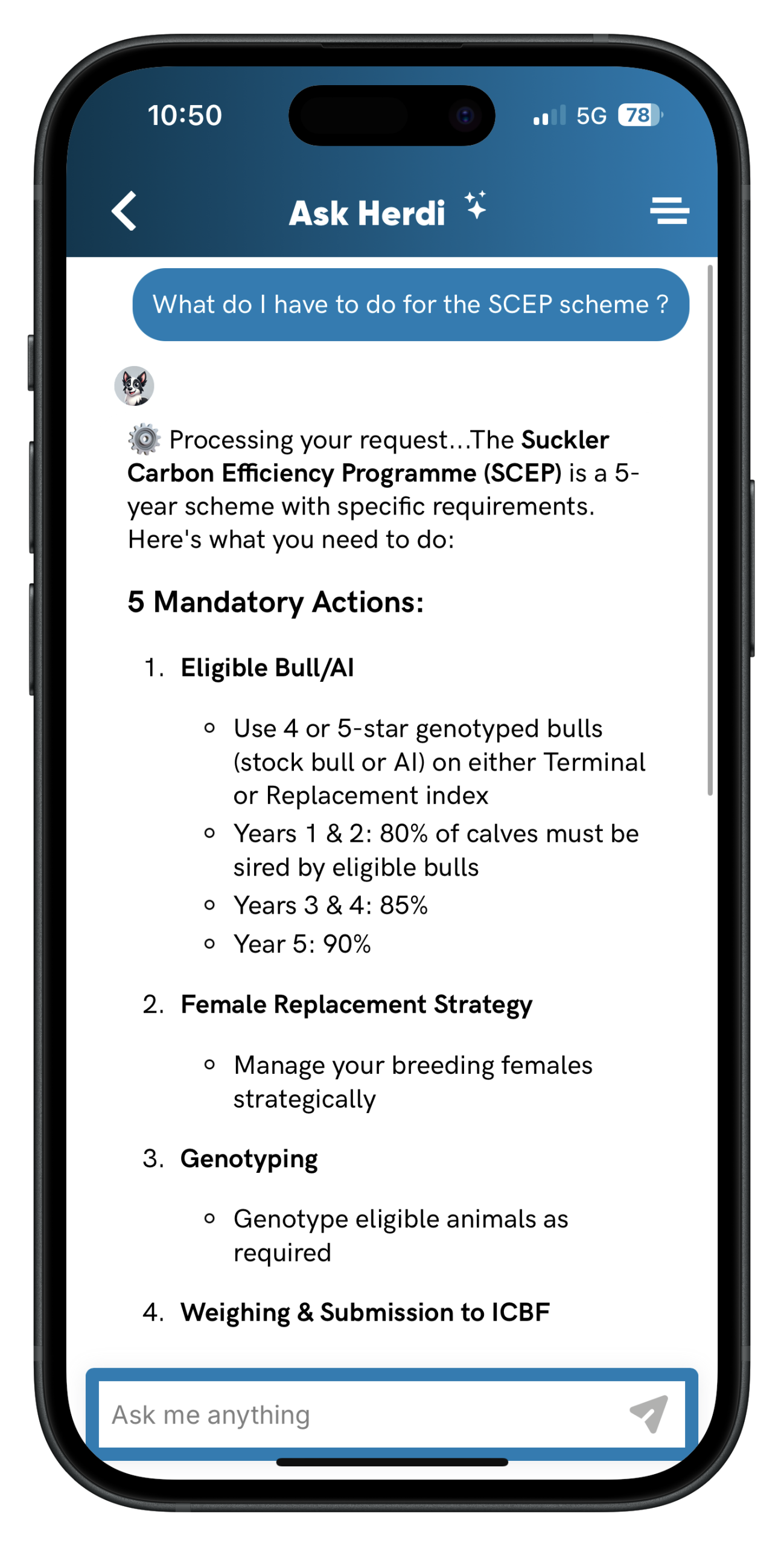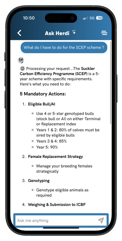 You can ask it anything - from deadlines and scheme rules to compliance checks and herd insights - and it gives instant, practical answers in plain English.