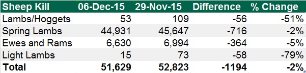 The national sheep kill for the week ending December 6, 2015 was back 5,010 head on the corresponding period last year, figures from the Department of Agriculture show.