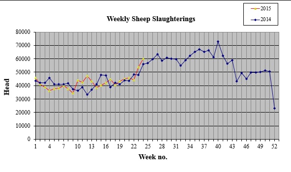 Irish production in 2015 as a whole is currently forecast to increase by 4% to 54,500t, despite a fall in the size of the breeding flock recorded in the Irish December survey. This increase comes as a result of an exceptionally good lambing season leading to higher numbers of lambs being born this spring.