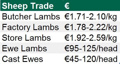 According to the Mart Manager, factory lambs made €1.78-2.17/kg while the heavier butcher type lambs made €1.91-1.96/kg.