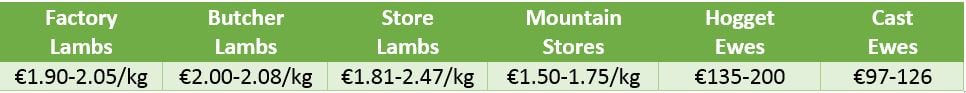 Strengthening factory prices have held a firm base under the country’s sheep trade. At present factory and butcher lambs are still making €1.90-2.08/kg while the demand for store lambs is ever present with lots freely making €2/kg.