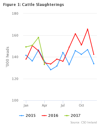 There was an increase in all cattle and sheep slaughterings for the first four months of the year at 4% and 13%, respectively (compared with the same period in 2016), while pig slaughtering fell 2%.