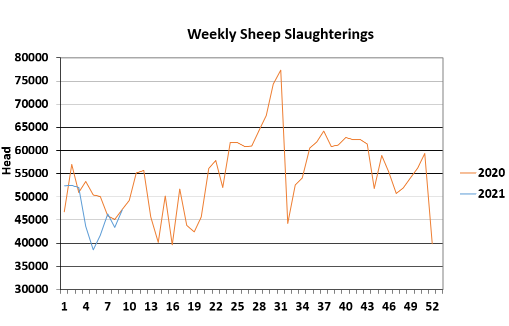 Looking at the throughput for the week ending March 7, a total of 47,217 sheep were processed, which was an increase of 3,757 head on the week before.