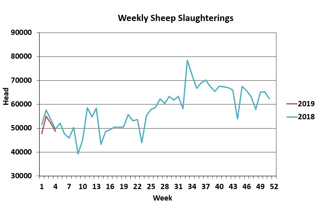 48,700 head of sheep were processed at Department of Agriculture approved slaughtering plants in the week ending January 27. This is back significantly on last week’s figure of 55,418. It is also below the figure for the same week last year – 49,678.