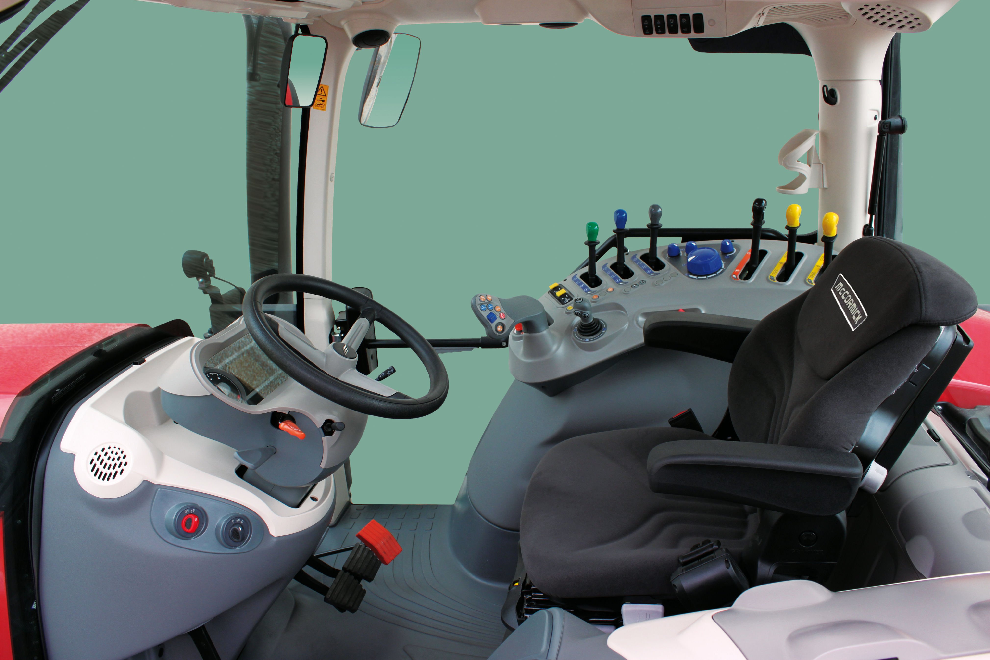 Ahead of them is the multi-function joystick, which carries a roller switch for linkage lift/lower and buttons for the engine speed memory and manual or auto road/field transmission shifting.