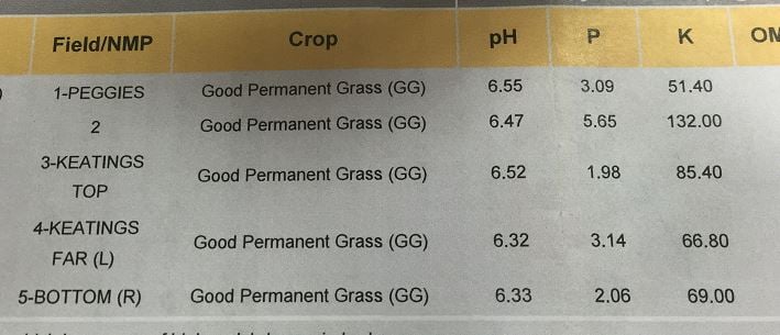 If we take the first sample (1-Peggies) this field is index 2 for both P and K. Out of the five samples taken only one field had adequate levels of P and K (field 2), which is grazing only.