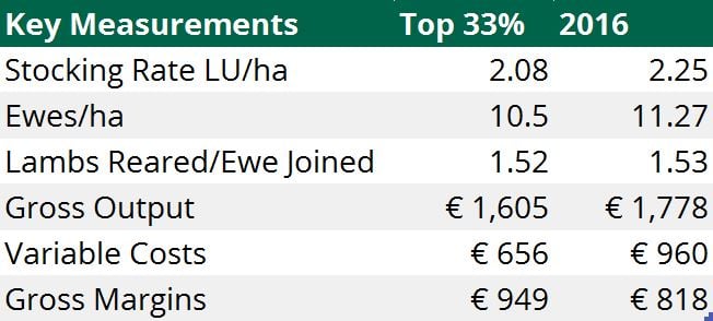 Overall, the farm carries 11.27 ewes/ha with a stocking rate of 2.25LU/ha, which also puts Byrne’s system of production ahead of the top 33% of sheep farms in 2016.
