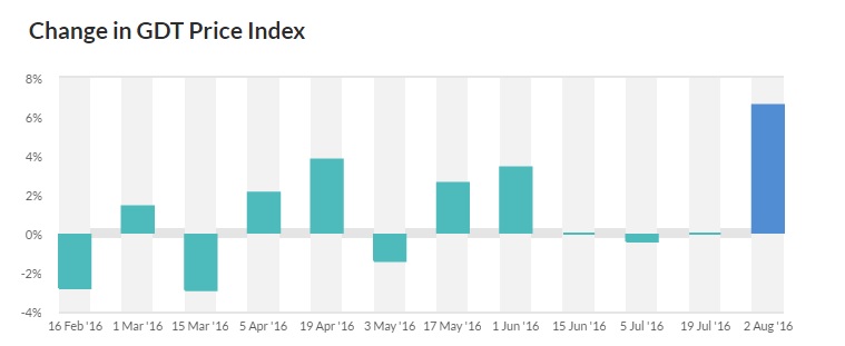 Dairy product prices rose 6.6% at today’s Global Dairy Trade auction, after several weeks of flat dairy prices.