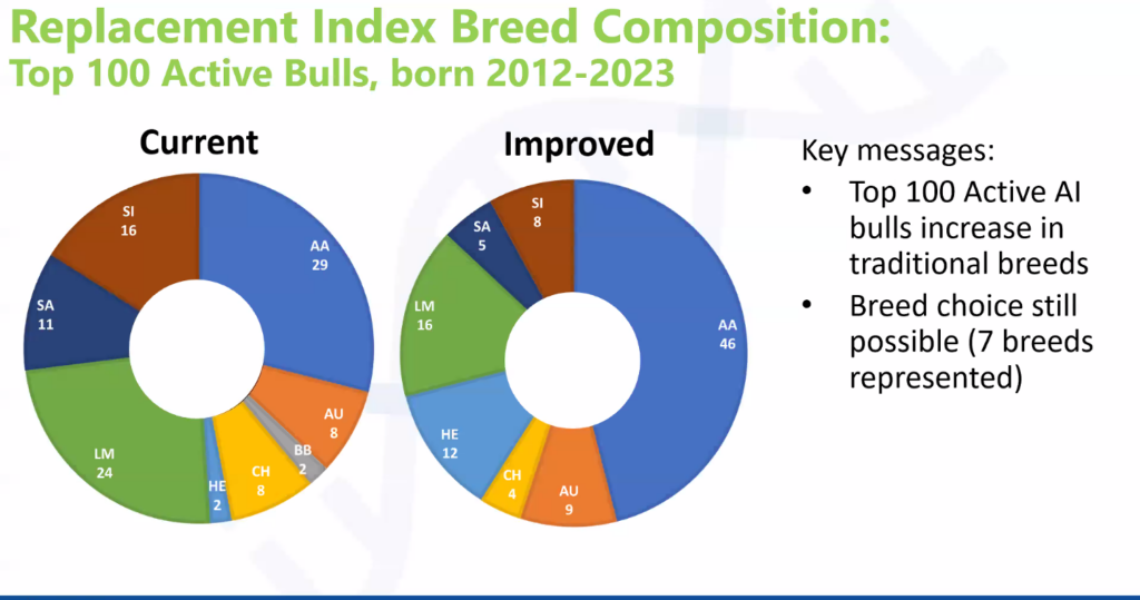 A look at the changes to the top 100 active AI bulls in the replacement index shows that the popular commercial suckler cow breeds such as the Limousin, Saler and Simmentals have fallen considerably while the number of Angus and Hereford bulls in this index has increased.