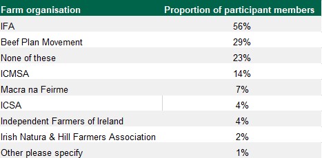 In terms of participant responses, the farm organisation with the largest proportion of respondent members is the IFA; some 56% of respondents said they are members.