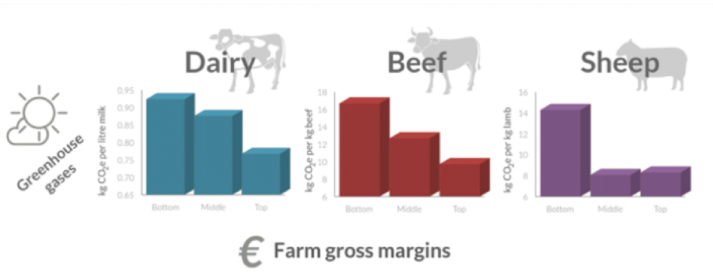 The report notes that the most profitable farms usually have lower agricultural greenhouse gas emissions per unit of milk or meat produced, underlining the positive effect of the practices promoted through the Teagasc/Bord Bia Carbon Navigator.