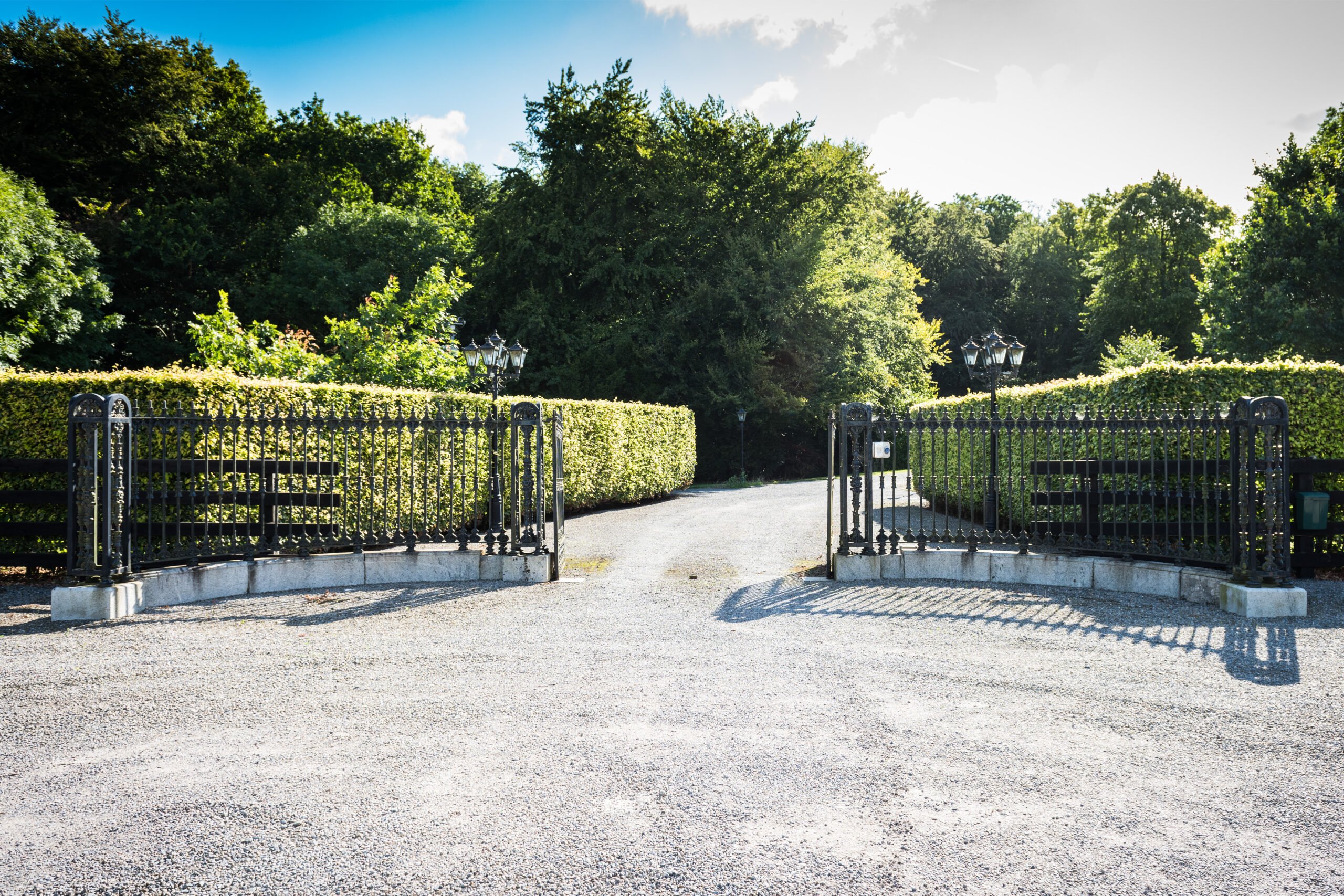 Rocketts Castle is accessed via a pea-gravel driveway, past a cast-iron electric-gated entrance, up to the gravel parking area at the front.