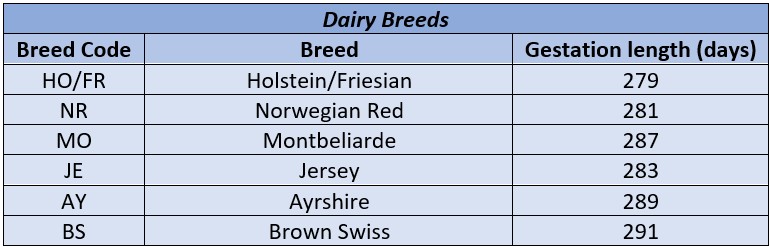 The ICBF has updated its gestation length figures for both the major dairy and beef breeds based on insemination and calving databased on insemination and calving data.
