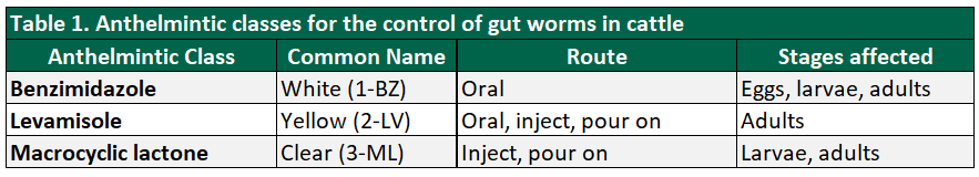 There are three classes of anthelmintic licensed for the treatment of stomach and lungworm in Ireland. These classes are listed in the table below alongside the parasite stages affected by dose.