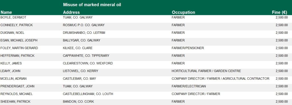 Finally, one farmer – Richard Gallagher, of Letterkenny, Co. Donegal – was fined €2,500 for the obstruction of a Revenue officer.