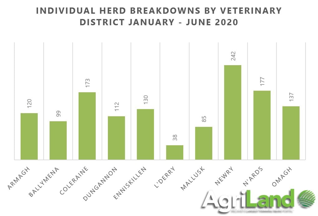Newry was the worst affected veterinary district with 242 unique herd breakdowns recorded (including those which had not been clear for more than 12 months).