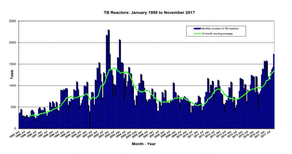 Over the last 12 months 2,240 herds tested positive for TB – well up on the 1,667 over the 12 months before.