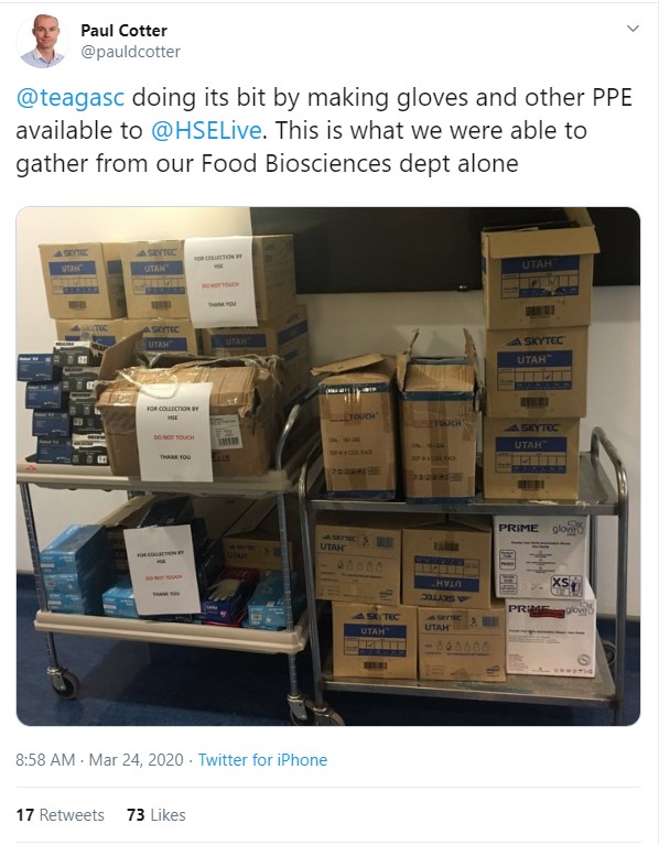 To date, Teagasc has been asked to assist by: providing staff who could assist with Covid-19 testing in a designated laboratory; and by providing personal protective equipment (PPE) to front-line medical staff.