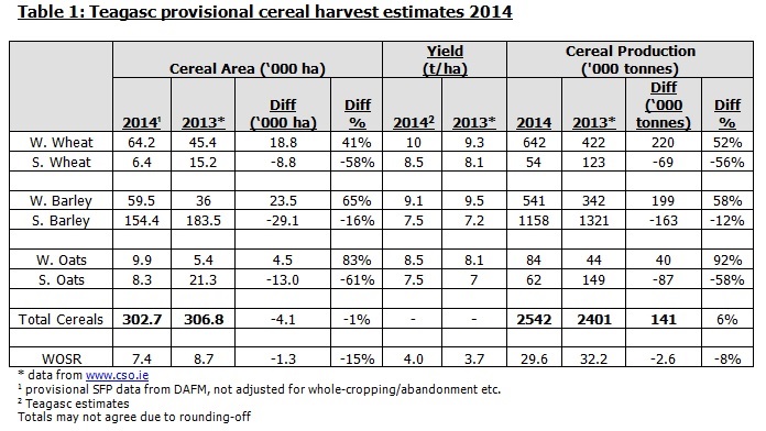 Teagasc says initial reports are good with yields above the five year average for all crops and excellent grain quality to date.