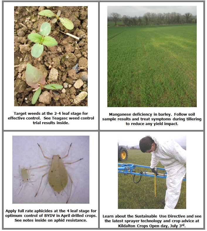Despite the late start, spring cereal drilling is virtually complete with only fields that had water lying, left to be sown. Early crops are beginning to tiller, while most crops are just emerging. All crops should be monitored for pest attacks, especially leatherjackets and slugs.