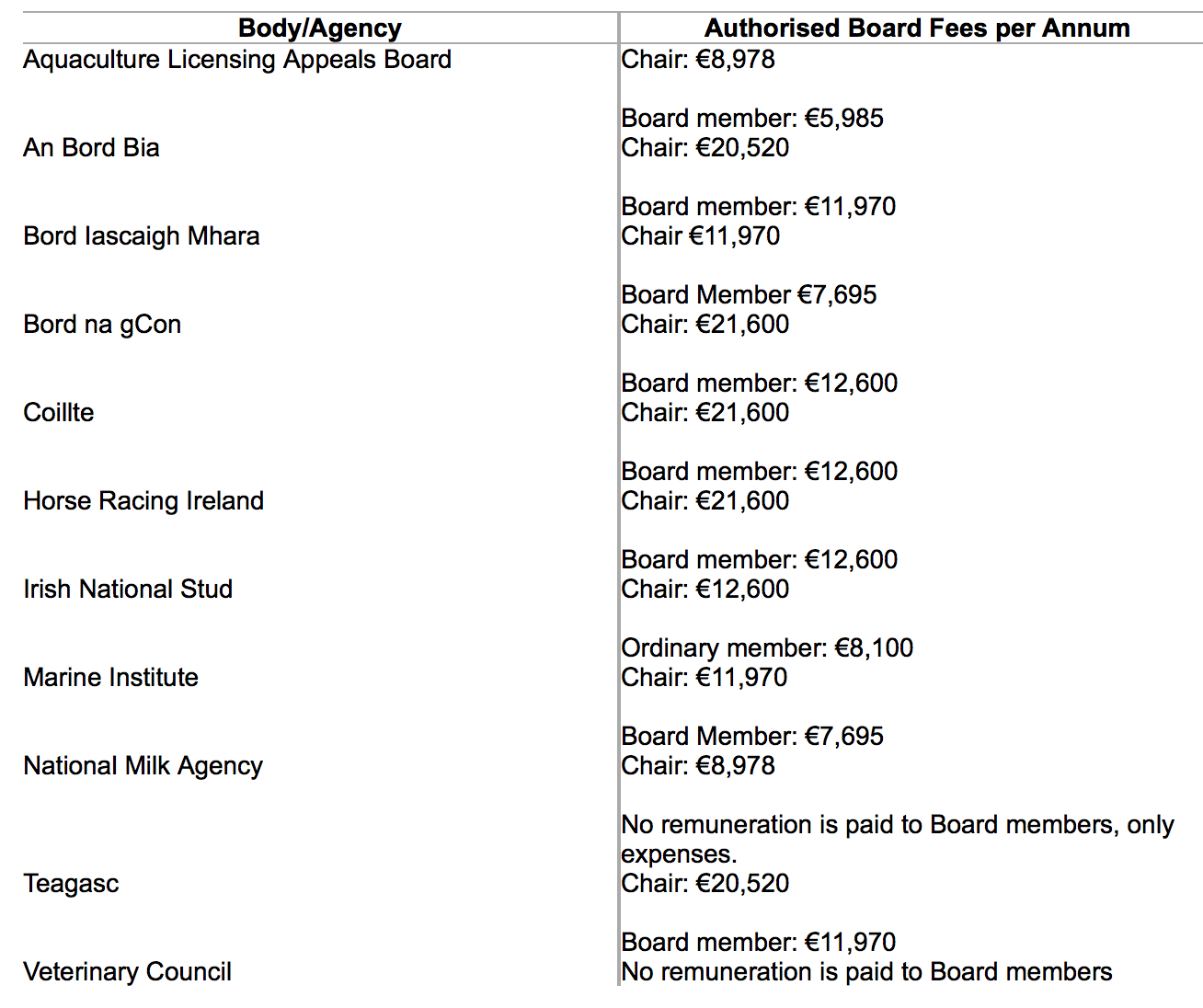 The Chairperson of Teagasc however, receives €20,520 and expenses are covered. Board members on other State bodies who operate under the Department of Agriculture, such as An Bord Bia, Horse Racing Ireland and Coillte, all receive payment for their services.