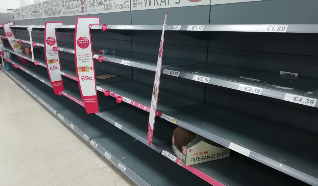 A number of empty shelves were evident last night following a frantic day at the tills in a number of supermarkets after the announcement of measures to limit the spread of coronavirus Covid-19.