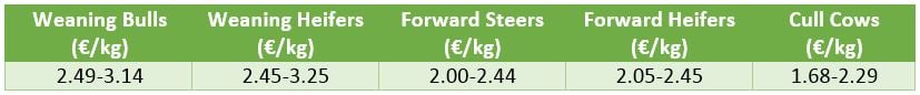He also said that the trade for heifers remained strong with lots selling from €2.41-2.60/kg for the store type heifers while the heavier forward type lots sold for €2.05-2.30/kg.