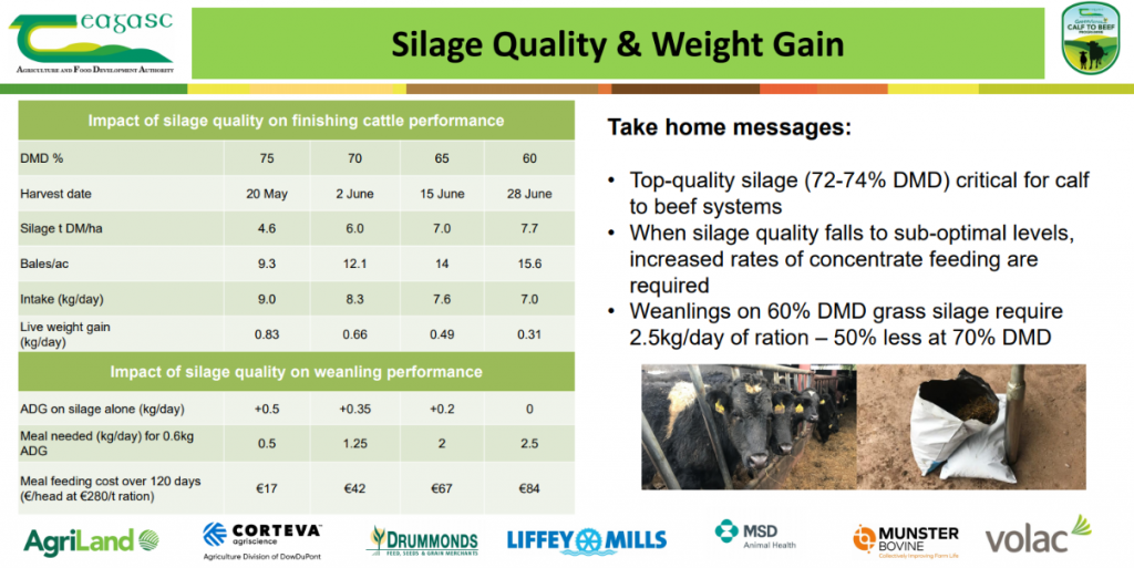 “With 60% DMD silage – that’s the end of June, so you are looking at 0.3kg/day,” he said. “The whole reason for having top-quality silage is to reduce meal intake; if you have low-quality silage, your meal bill goes up.”