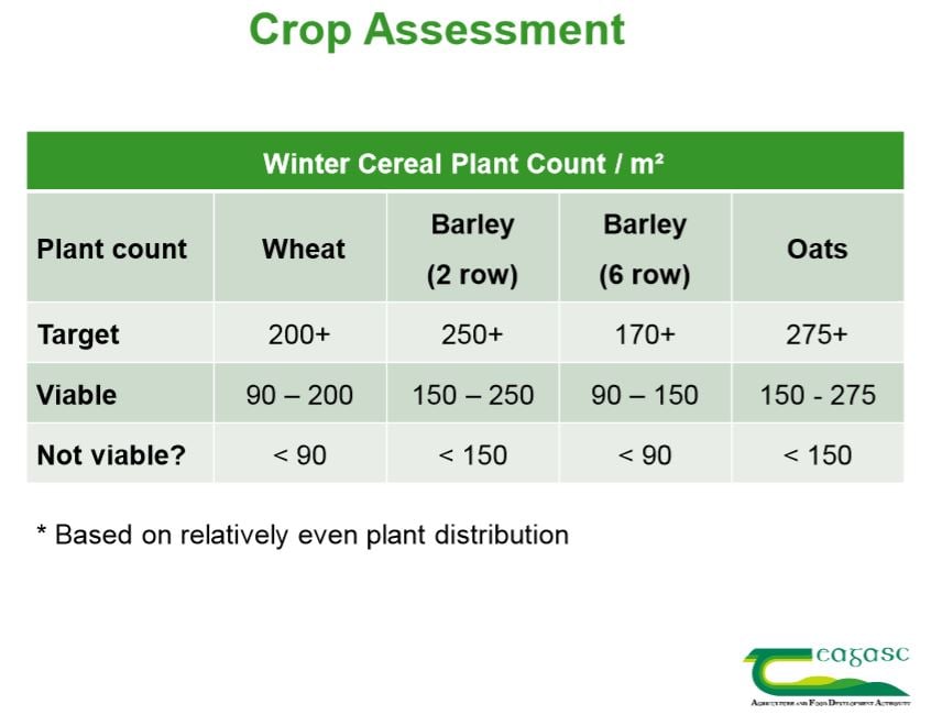 It should be noted that there is a correction to the table. The viable plant count for oats is actually 90-275 plants/m². Oat crops are therefore viable at a plant count less than 90 plants/m².