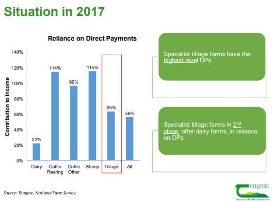 “Even though it’s not as bad as the situation for the drystock sectors €6 out of every €10 still comes from direct payments for the specialist tillage farming sector.”
