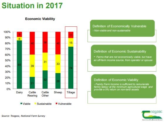 On a very positive note 74% of specialist tillage farms were deemed to be economically viable. Once again second only to dairy – 85% of dairy farms are described as viable.